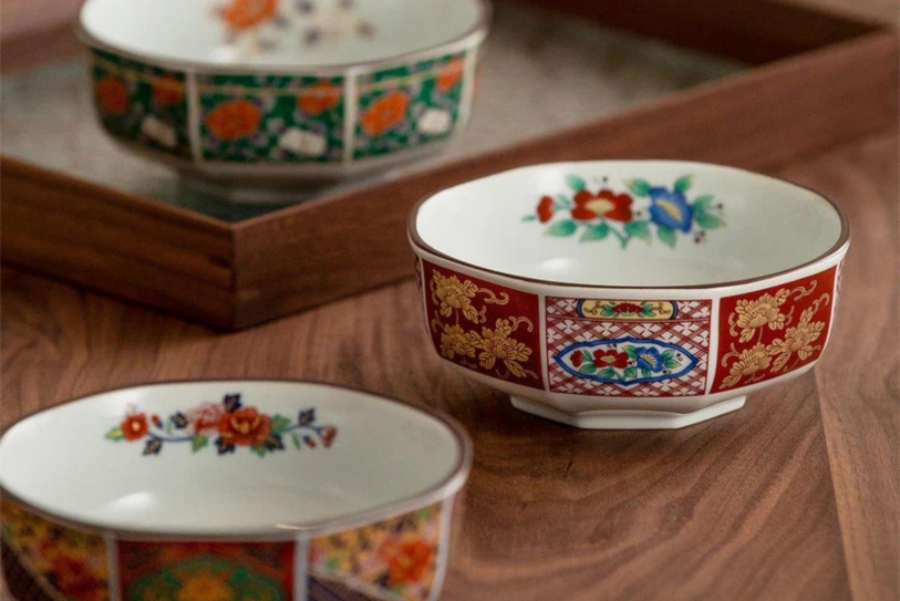 Japanese Mino Ware Court Dyed Brocade Octagonal Bowls Set