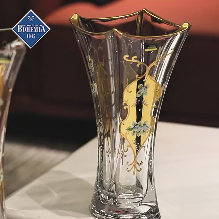 Inspired by the soft curves of blooming petals, the Bohemian Enamel and Gold Crystal Tulip Vase exudes charm and sophistication. Produced in the Czech Republic, this vase features a rounded body with gently flared edges, hand-decorated with golden floral panels and white enamel tulips.