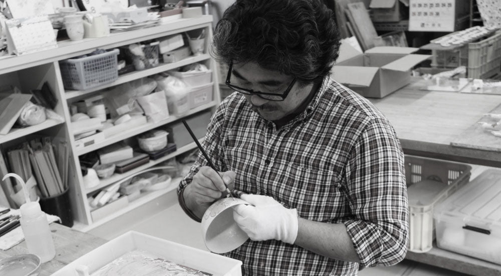 Sato Tsuyoshi is a distinguished ceramic artist who combines the spirit of Kutani-yaki (九谷焼) ceramics with the techniques of sumi-e (墨絵, Japanese ink painting). As he learned the pottery techniques of Kutani-yaki at the Kutani Ceramic Art Institute (九谷焼技術研修所) starting in 1986 under the guidance of Takao Togei (高尾益俊), Satō mastered the unique sumi-e technique known as Tsukedate (付け立て). This technique allows him to create expressive, one-of-a-kind pieces that are full of artistic tension and vitality.